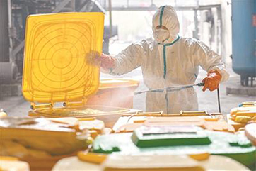新冠肺炎疫情發(fā)生后,每天產(chǎn)生的巨量醫(yī)療廢物成為武漢市亟待解決的重要問題。圖為近日,在武漢市青山區(qū)云峰公司,工作人員在對醫(yī)療廢物轉(zhuǎn)運箱消毒。新華社記者 才揚 攝3月11日,記者從國務(wù)院聯(lián)防聯(lián)控機制新聞發(fā)